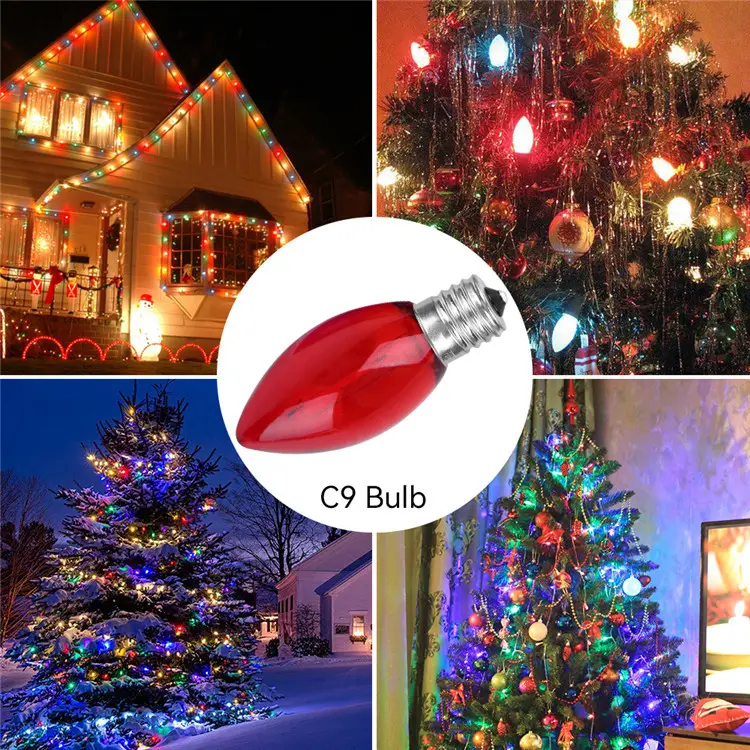 This C9 bulb features a smooth transparent lens for enhanced light transmission and a clear, point-like appearance. The lens height is approximately 1 5/8 inches, and the overall height of the bulb is approximately 2.5 inches, ensuring excellent visibility against outdoor gardens and roof lines. The lightweight and durable plastic body, weighing approximately 0.025 kg per unit, facilitates large-scale deployment and replacement. A variety of color options, from warm white to pure RGB, are available, allowing for quick matching with festive themes or commercial outdoor spaces. Direct AC 110V operation eliminates the need for an external driver and allows for plug-and-play operation with an E17 light string socket. The supplier also offers lighting and circuitry design, on-site measurement, and Dialux/Agi32 design services to facilitate engineering deployment.