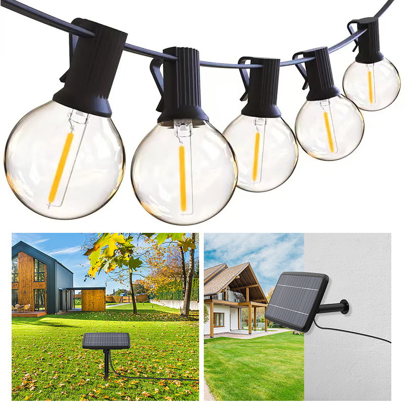 The LED Outdoor String Lights Globe G40 Bulb Solar Fairy String Lights are solar-powered G40 bulb strings designed for gardens and weddings. They emit a soft, warm white light at 2700K, with a 360° uniform floodlight, creating a festive and relaxing atmosphere for patios. The entire set is IP65-rated, with PVC/rubber cables and high-purity copper conductors, suitable for long-term outdoor use. Powered by both a built-in battery and solar power, they support basic dimming settings and come with a one-year warranty and professional lighting design and installation services.