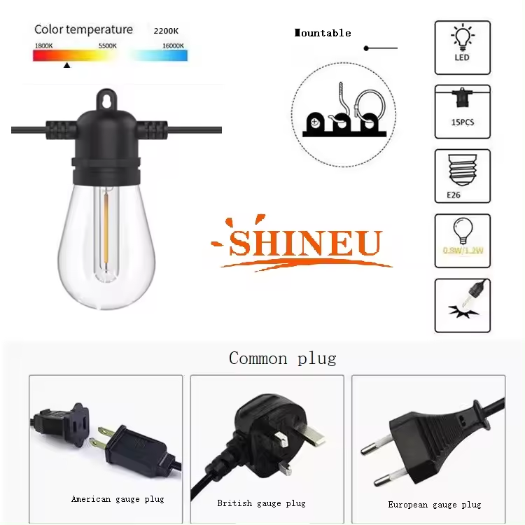 The S14 Garden Lights Outdoor Led String Fairy Twinkle Lights Decorative Party Holiday Xmas Light Garden for Patio Wedding is an outdoor decorative S14 light string designed for gardens, patios, patios, and wedding parties. The string is 48 feet long, features warm white light, and is designed for decorative lighting. It can be connected in series to cover a larger area. With IP65 protection, it withstands rain and dust in outdoor environments and a rated lifespan of 30,000 hours, making it suitable for holiday decorations such as Christmas, Halloween, and Valentine’s Day. Provided by Huizhou shineu Lighting Technology Co., Ltd., under the brand name shineu, it supports customized packaging and logos, meeting both home and commercial event needs.