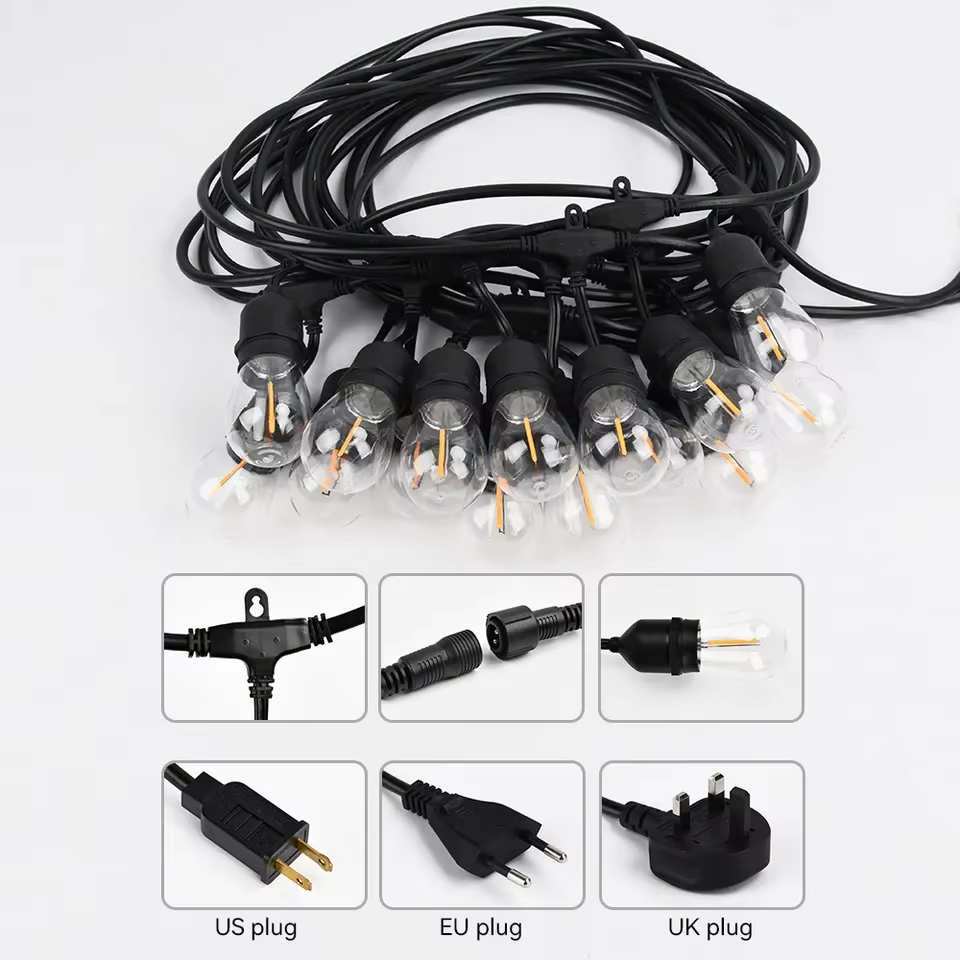Bring professional-grade ambiance to patios, cafés, and backyards with our 48 ft commercial string lights featuring 15 S14 bulbs. Engineered for year-round outdoor use, this IP65-rated set delivers warm 2700K illumination with 100–300 lm output per run, creating a cozy, inviting glow for entertaining, hospitality, and retail spaces. The black heavy-duty cable resists weather and abrasion, while dimmer compatibility enables smooth mood control from bright task lighting to soft decorative accents. Infrared remote functionality offers convenient on/off and brightness adjustment. Built for North American power (AC 110V ±10%), the system ensures stable performance and up to 30,000-hour lifespan for low maintenance ownership. Optional customization—logo, packaging, and graphics—supports brand programs and wholesale rollouts. Backed by a 3-year warranty and supported by turnkey lighting layout services (Dialux Evo, AGi32, AutoCAD), this set integrates seamlessly into both residential and commercial projects. From festive holiday décor to everyday garden lighting, the durable S14 design stands up to rain and dust, maintaining consistent, warm-white output. Choose a cost-effective, long-life outdoor lighting solution that elevates atmosphere while reducing replacement cycles.