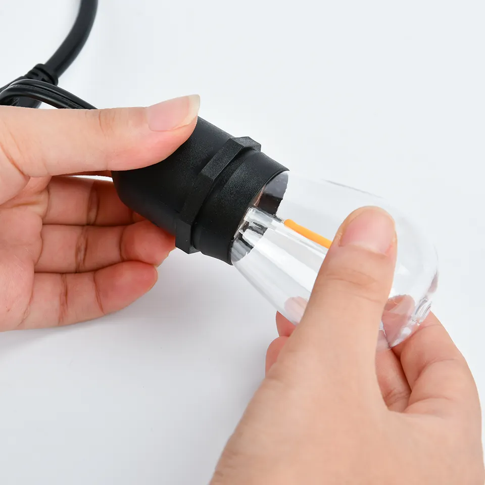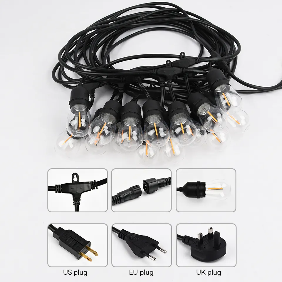 This shatterproof outdoor light string is suitable for decorative lighting such as wedding arches, banquet awnings, dining and bar terraces, patio barbecue areas, and balcony fences. The warm white light and dimmable function allow for flexible brightness adjustments to suit the event, creating a friendly, cozy, or lively atmosphere. The 48-foot length and daisy-chainable design allow for straight, herringbone, zigzag, and grid layouts to cover long corridors, garden paths, and large courtyards. IP65 and a wide operating temperature range enhance stability in rainy seasons, high summer temperatures, and low winter temperatures, making it suitable for everyday home decoration and holiday decorations such as Christmas, as well as light commercial applications such as cafes, B&Bs, and market stalls.